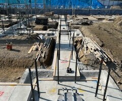そして鉄筋と型枠の間にコンクリートを注入し、建物を支える基礎を形成いたします。施工後は建築基準法や構造基準に基づいて検査が行われ、合格すれば施工完了です。